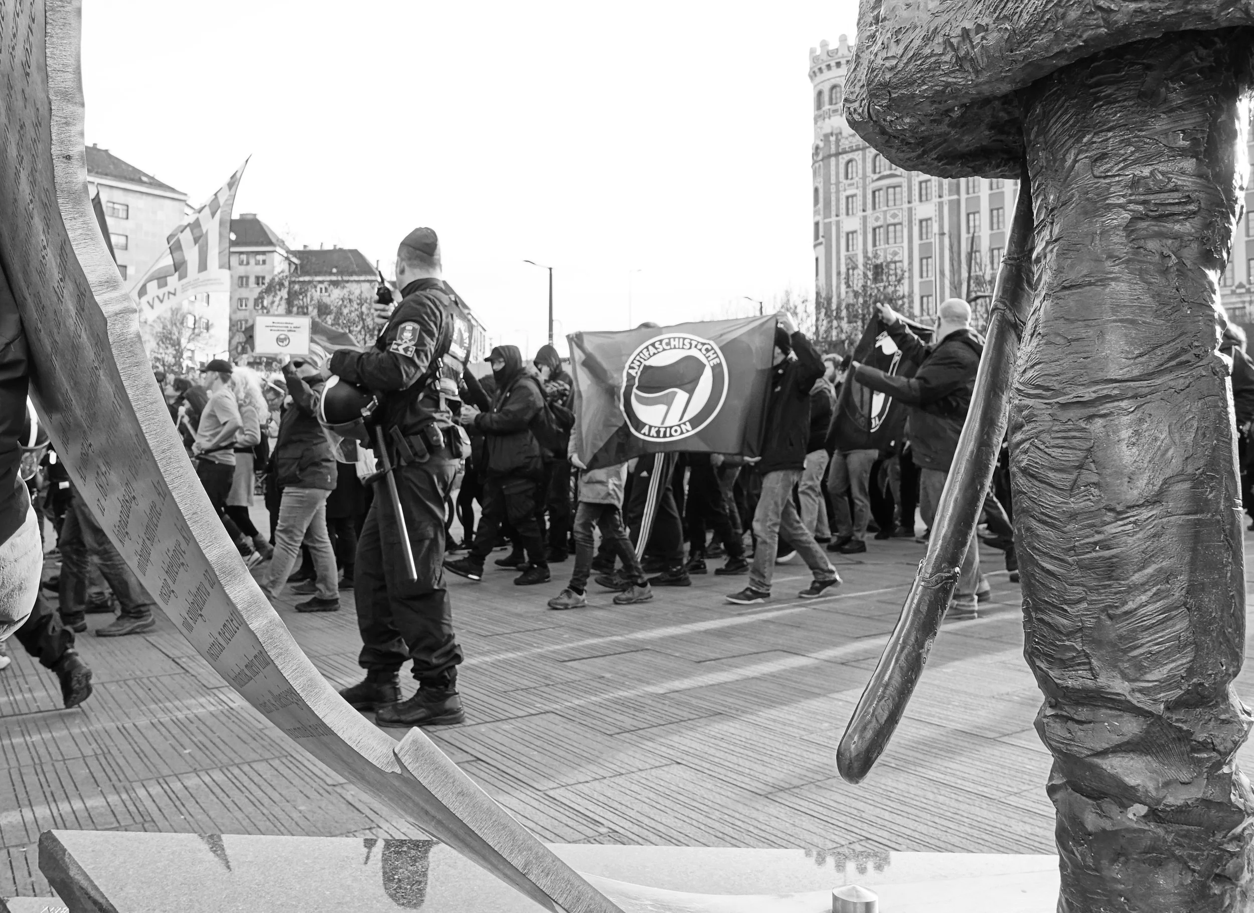 Seventy-nine years later, the usual flower sellers, buskers and beggars had been displaced by a gathering of a hundred Hungarian and other European Antifascist demonstrators. Some were masked and carried the usual banners and paraphernalia of protest. Since the pandemic, masks are no longer such a symbol of secrecy and the wearers didn’t appear threatening. Watched by as many police officers and members of the media, the leftist gathering awaited the far-right to mount a counter-demonstration. Passers-by continued their usual Saturday programmes, seemingly unaware or unconcerned by events on this mild afternoon.