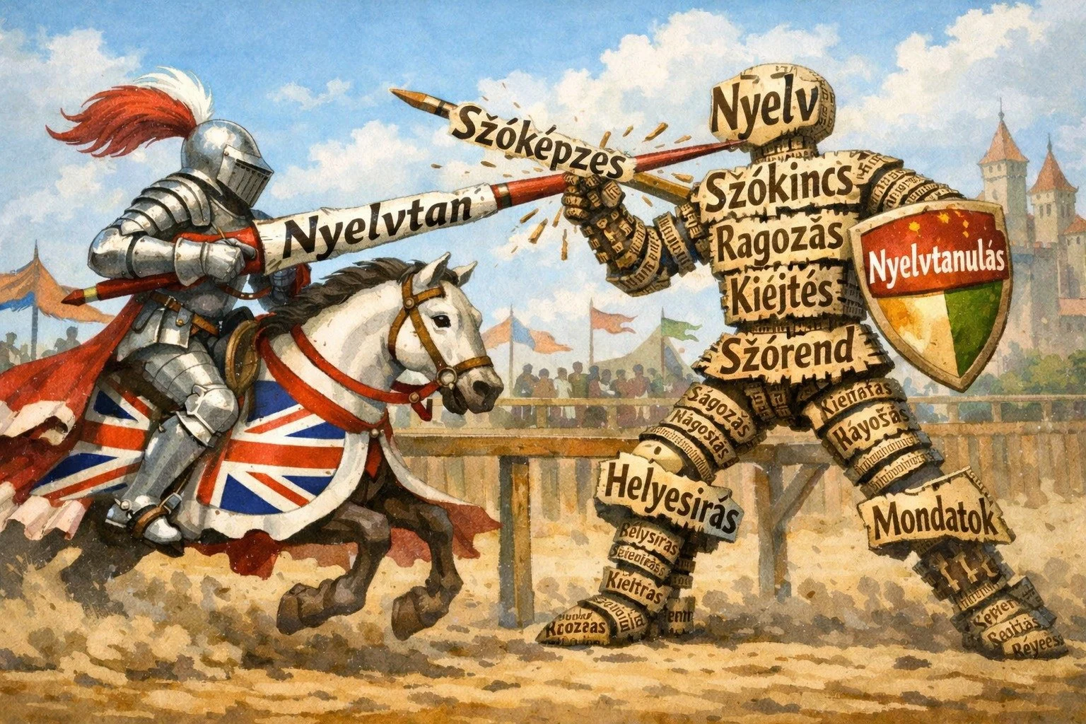 Arriving this way, you get the sense of trying to storm the Hungarian language bastion even before your lesson has begun. Despite the skilled, enthusiastic teachers and solid learning materials, you know you’re in for a battle. There’s no such thing as an easy class; only a retreat from the enemy is possible. Most expats, especially Brits, give up after a course or two. This is not a joust for the faint-hearted. Like Magyar horsemen from earlier history, the language cases keep coming at you. Boxes of prefixes and suffixes that must be unpacked and examined closely to be understood in English. Sometimes the prefixes do a cheeky about-turn and hide behind verbs rather than sit in front of them! The joust is often unfair.