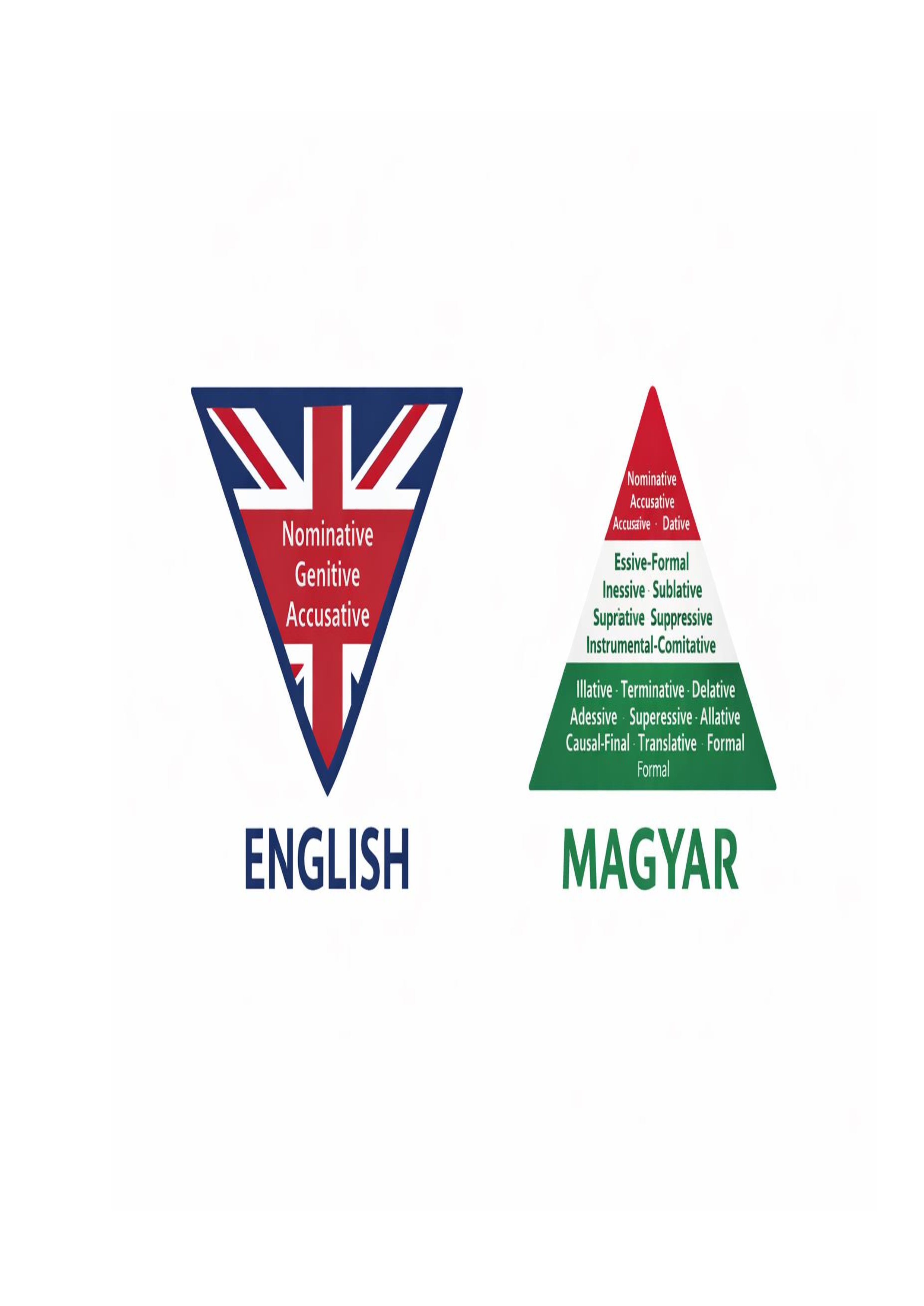 Grammatical cases are used to mark the grammatical function of words in a sentence **. In practice, they signify which alterations you have to make in a particular sentence to maintain the logic of the language. Fifteen of the Magyar cases shown, actually need to be learnt at the base of the triangle, some mastered before progressing upwards.