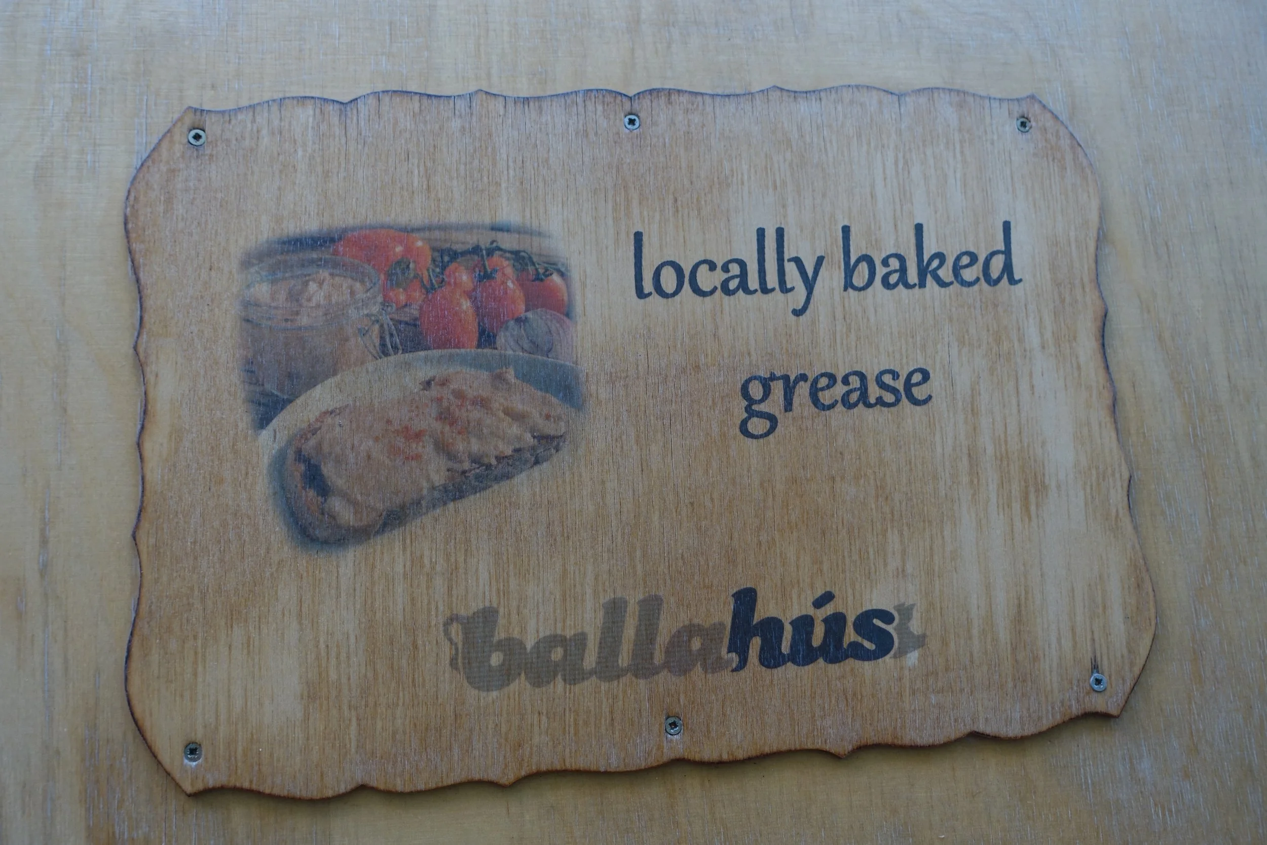 Advert outside take-away restaurant reads-’In this place- baked pork scratchings.’