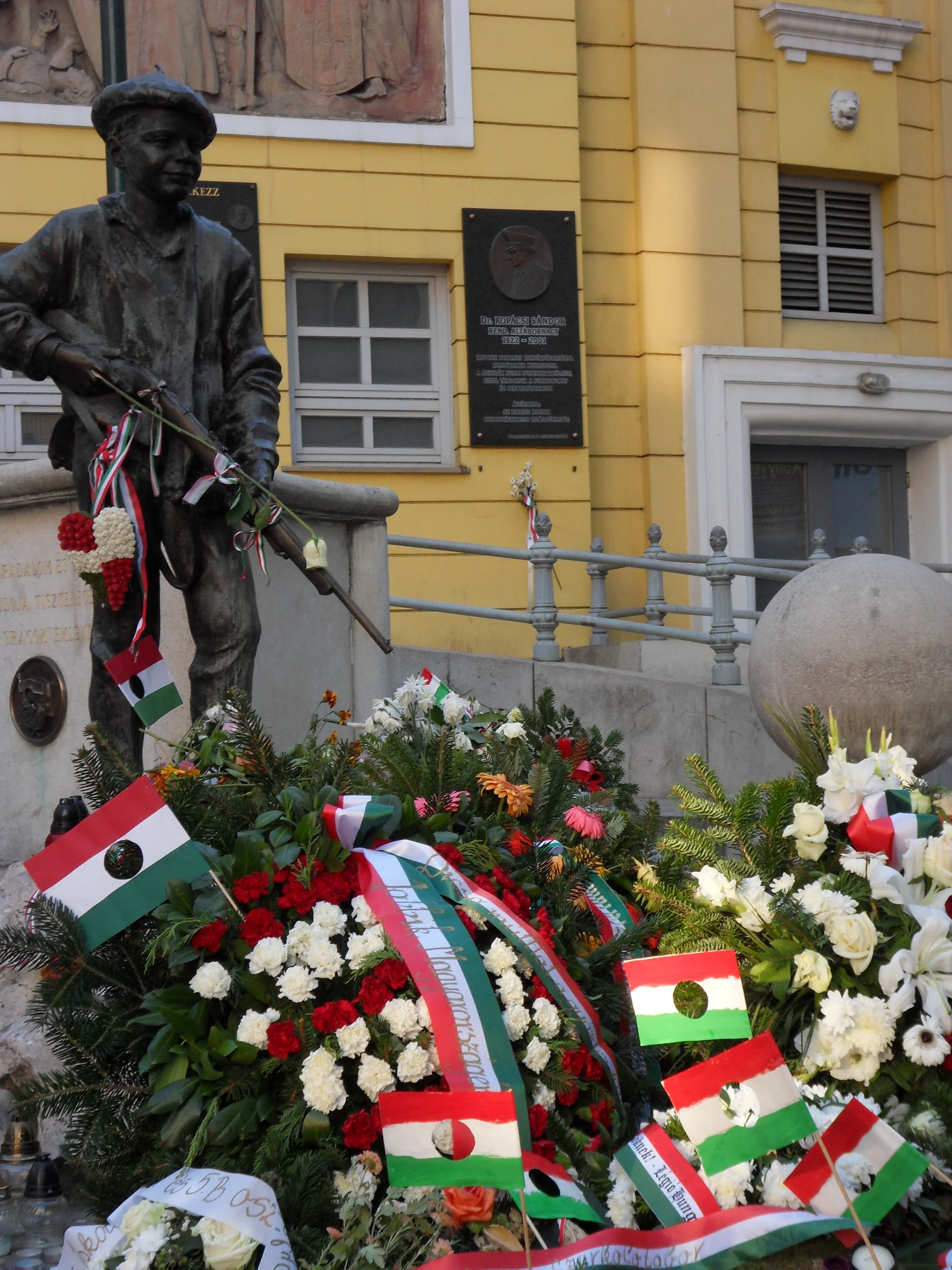 Symbols of 1956- a Corvin streetfighter and Hungarian flags with Soviet hammer and sickle removed from the centres.