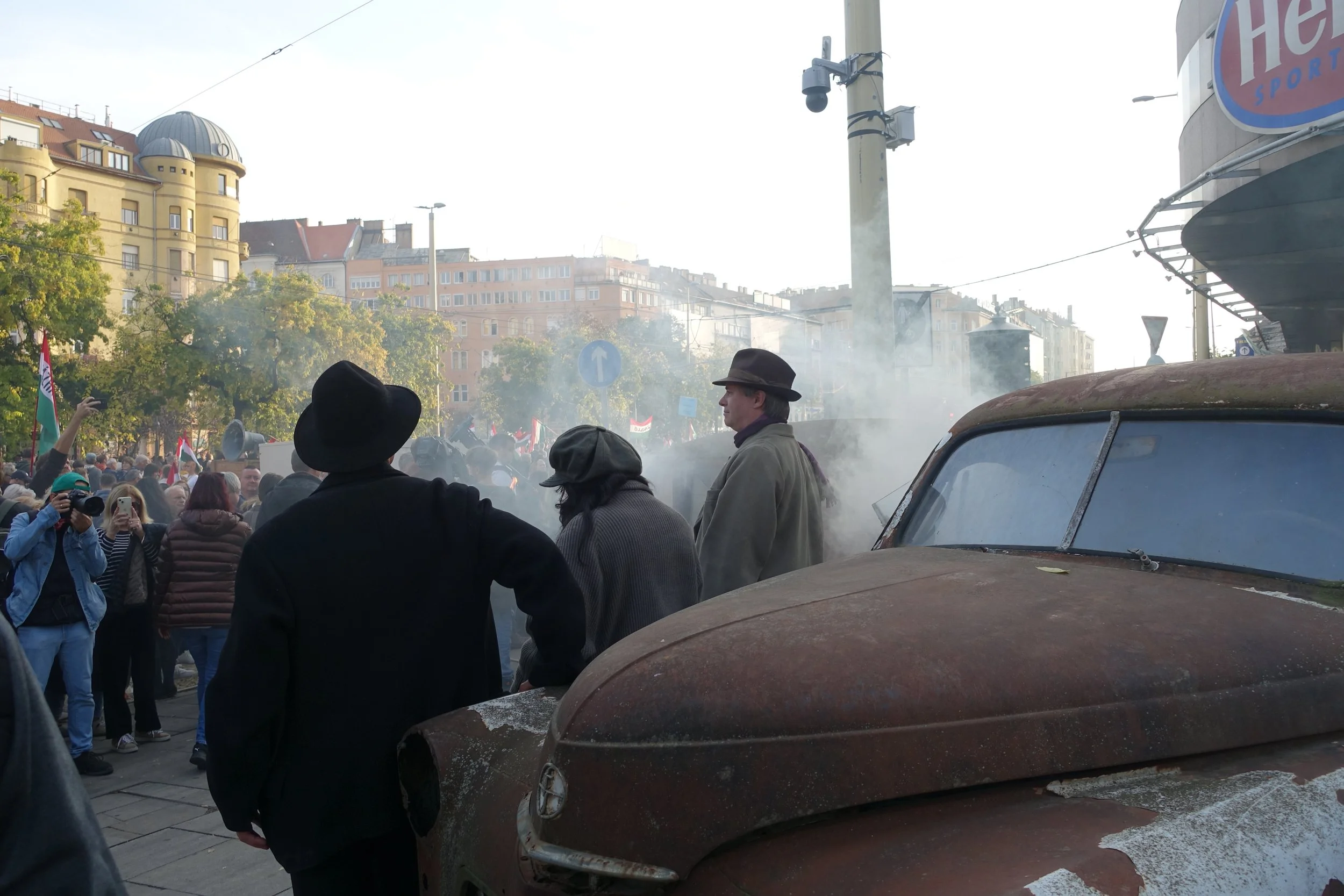 Smoke in the air before Péter Magyar spoke at Széna tér