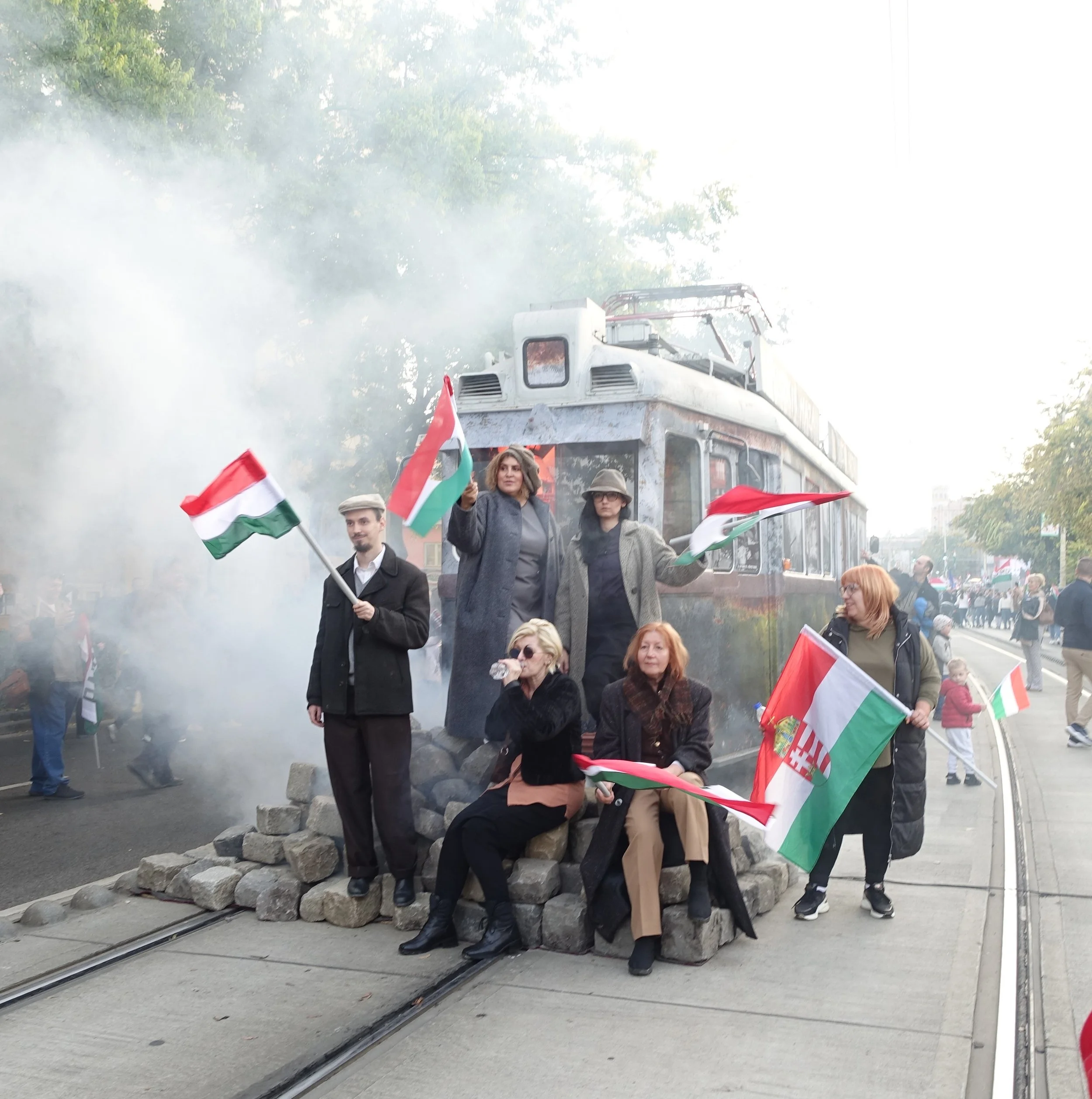 Tisza had organised an afternoon march from near the Danube to Széna tér. Along Margit körút they positioned burnt out trams and endlessly smoking vehicles as strange memento mori to the failed revolution. Some serious money had been spent on their day’s proceedings. Dusk was approaching when Magyar spoke from a raised platform. The crowd below him and down the boulevard looked like the largest of the day. It was also the most mixed in terms of age and gender. Tisza offer a centre-right alternative to Fidesz that is willing to work with Brussels and is against Putin’s invasion of Ukraine. In terms of domestic policy there may not be many differences with the present government. Their most distinctive feature is that they are not Fidesz and Peter Magyar’s, is that he is not Viktor Orbán.